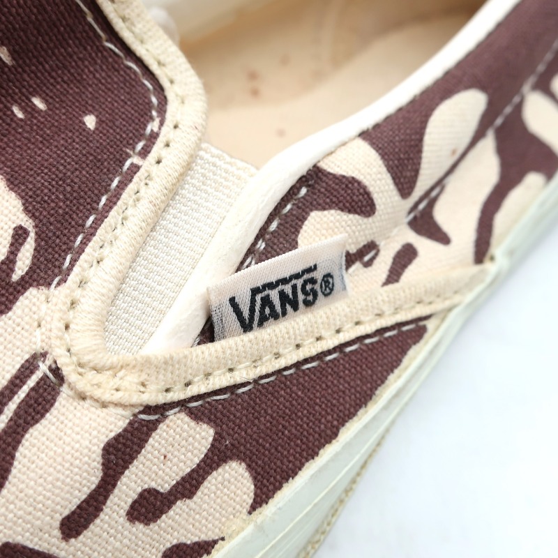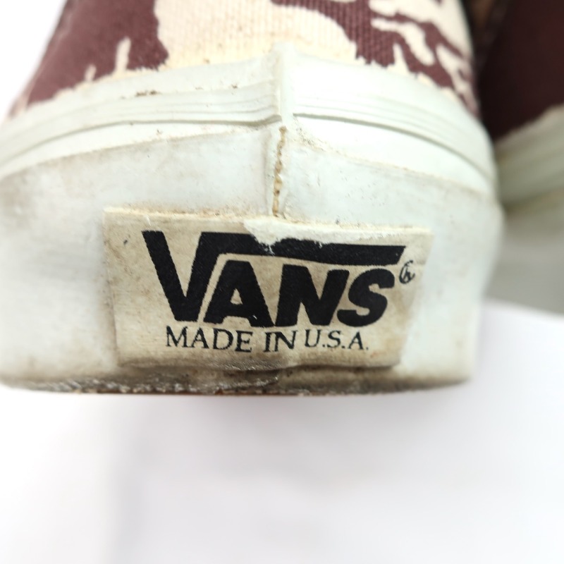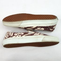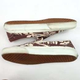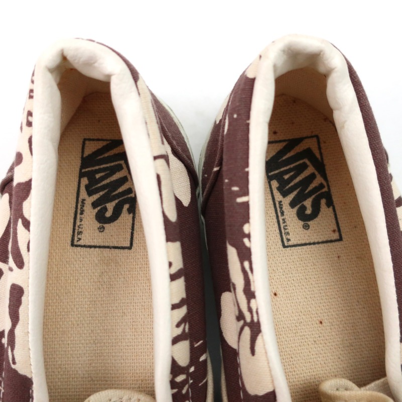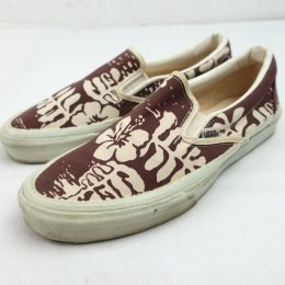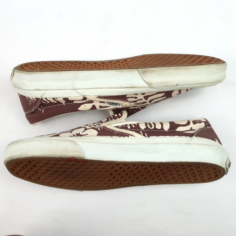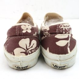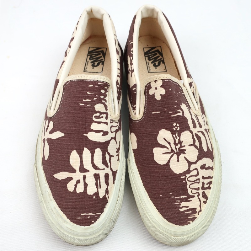 金沢店の商品になりますので、 電話でのお問合わせは076-210-7010へお願いします VANS SLIP-ON 個人的に大好きな柄の1つのハイビスカス です。 これだけVANSを紹介してきましたが、ハイビスカスのSLIP ONはほとんど紹介できていないと思います。 しかも茶色のハイビスカスは中々出ないです。 多少使用感はありますが、VINTAGE VANSとしてはかなり綺麗な方だと思います。 ラバーも全く問題ないコンディションで着用に問題になる様な点はありません。 お好きな方、サイズの合う方は是非ご検討ください。 詳細が気になる方はお気軽にメールにてお尋ね下さい。こちらの商品は全て店頭でも販売している為ご注文頂いた時点で商品が欠品している可能性があります。お手数を掛けますが電話かメールで連絡の上在庫確認後の発送になります。 お支払い方法はクロネコヤマト代引き(クレジット可)のみになります。 送料は全国無料。返品は受け付けておりません。ご了承の上お買い上げ下さい