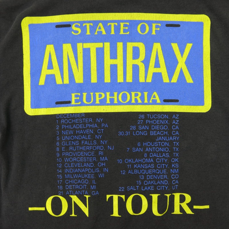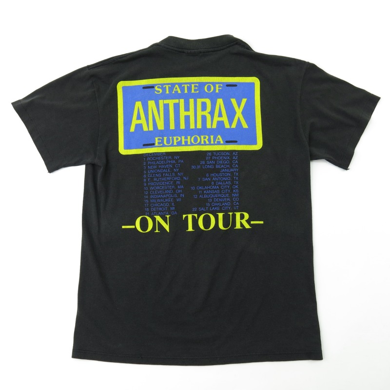 富山店の商品となります。 電話での問い合わせ:076-492-8634 88’s ANTHRAX STATE OF EUPHORIA 12月のTOUR TEEです。 50/50のテロっとした生地で袖シングル、 裾ダブルです。このグラフィックにもある様 に丁度目に着てSHORTSで合わせて下さい CONDITION:使用感は50%程度あり色落ち小傷 ステッチ解れが僅かにありますがまだまだガン ガン着て頂ける状態で酷い物はありません。 神経質な方は必ず店頭でご確認後の購入を お願い致します。 当店のシステムは買い物カゴを使用していない 為ほんの少しの差で注文が入っての売り違いや 店頭でも販売している為ご注文頂いた時点で 商品が欠品している可能性があります。 お手数を掛けますが在庫確認後の発送になりま すので予めご了承頂ける方のみお求め頂けまし たら幸いです。当店の通販規約をこちらで必ず ご確認頂いてから当店をご利用ください。 お支払い方法クロネコヤマト代引(クレジット可) のみになります。 返品は受け付けておりません。 ご了承頂ける方のみお願い致します。