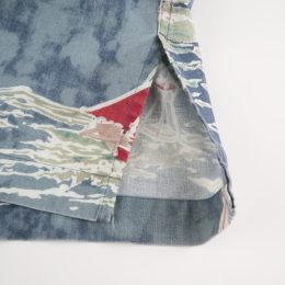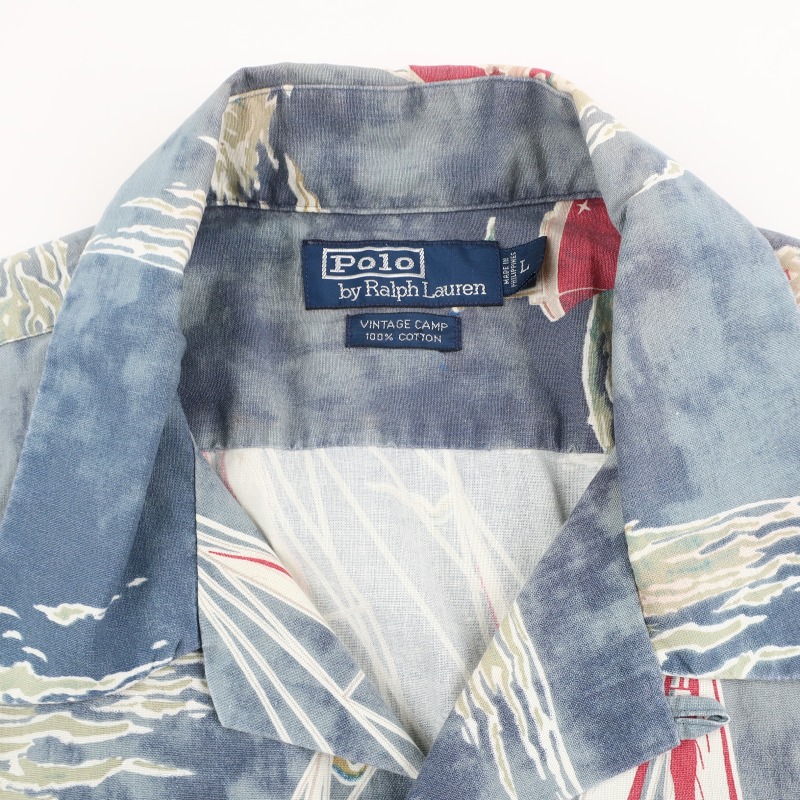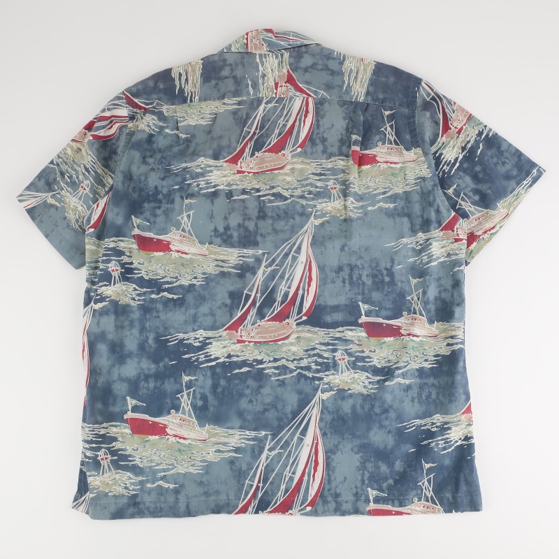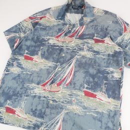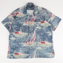 スモークブルーのベースにヨットの赤いヨットの柄が映える印象的なファブリックの開襟シャツです。 左右の柄合わせもピッタリで、コストの掛かっている仕立てです。