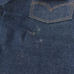 右ヒップポケット下に半ペースト状の粉の様な物が付着しておりますが、シミなどではなく擦ると取れてきますので洗濯で問題なく落ちるかと存じます。