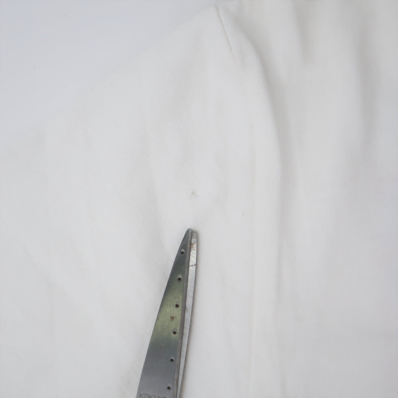 使用感はあまり強くなく、生地感はしっかりしておりますが、右袖に1mmにも満たないほどの小さなピンホールが御座います。