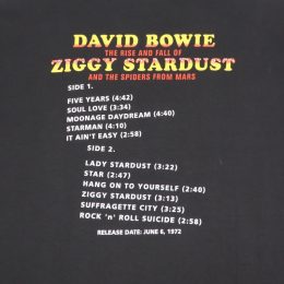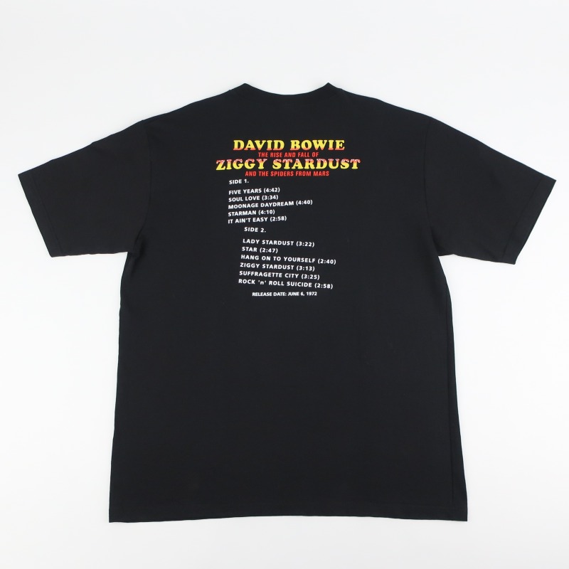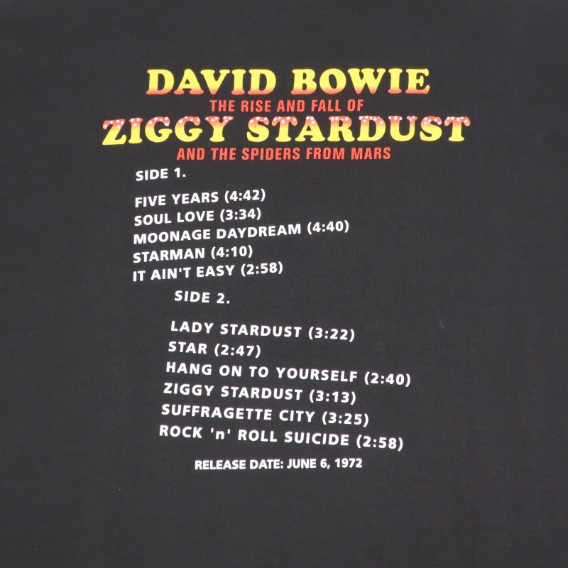 DAVID BOWIE5作目となるスタジオアルバム、原題”The Rise and Fall of Ziggy Stardust and the Spiders from Mars”のアートワークと、背面には収録曲目がプリントされたTシャツです。