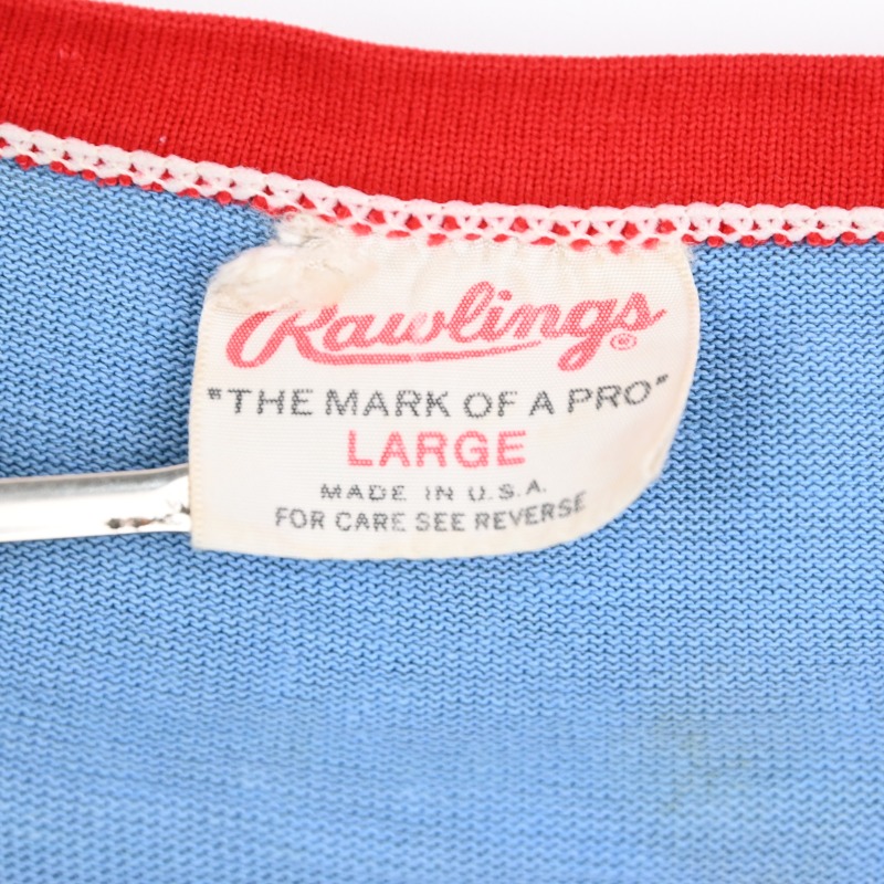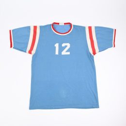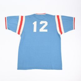 古いJERSEY生地に発色の良いライトブルーが良い雰囲気の1枚です。 ナンバリングは生地が縫い付けてあり、プリントでは御座いません。