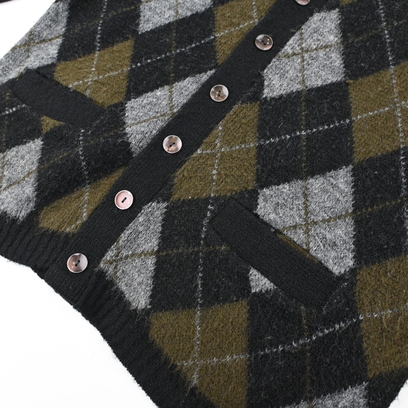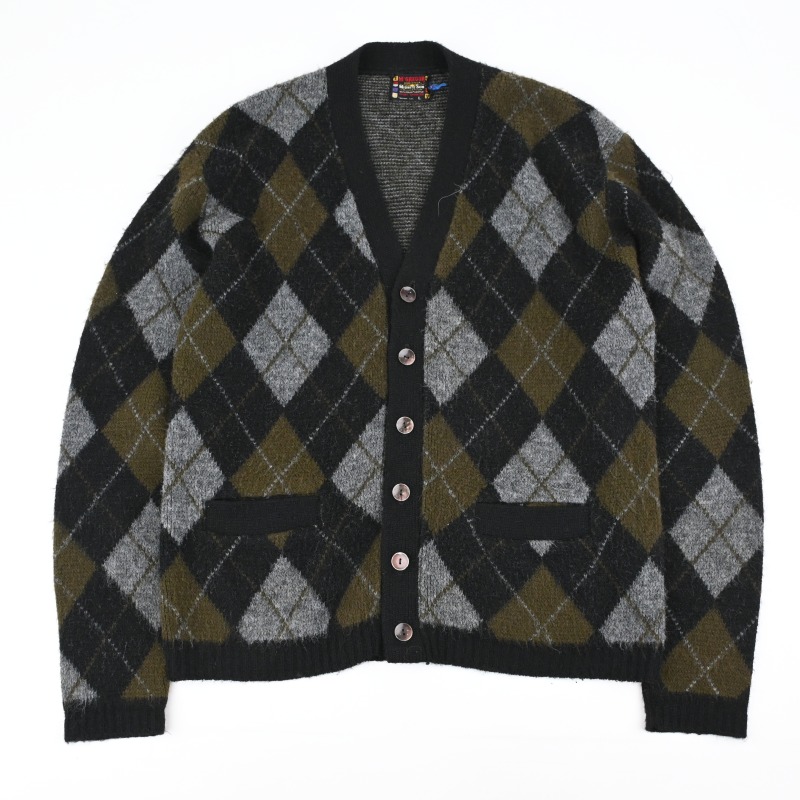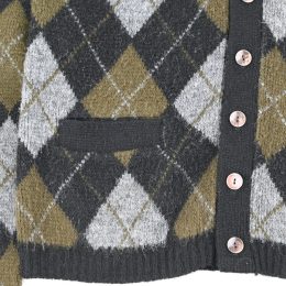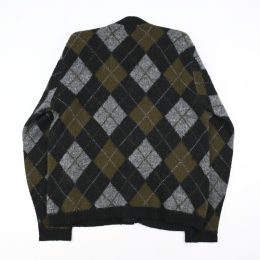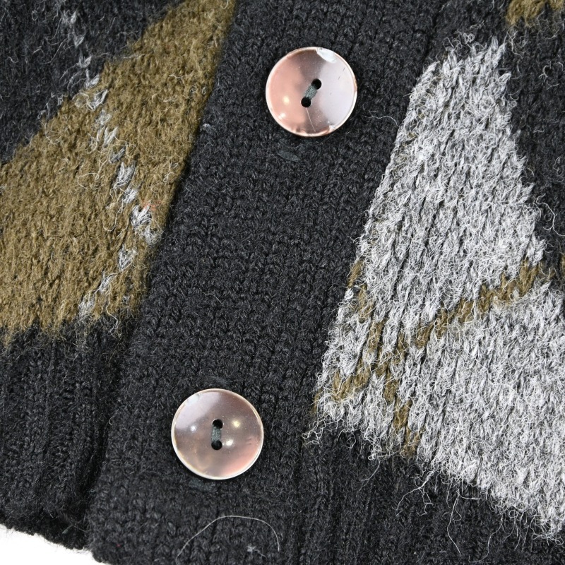 BLACK/OLIVEの渋い配色のアーガイルパターンで、 起毛加工されたアクリル生地のカーディガンです。