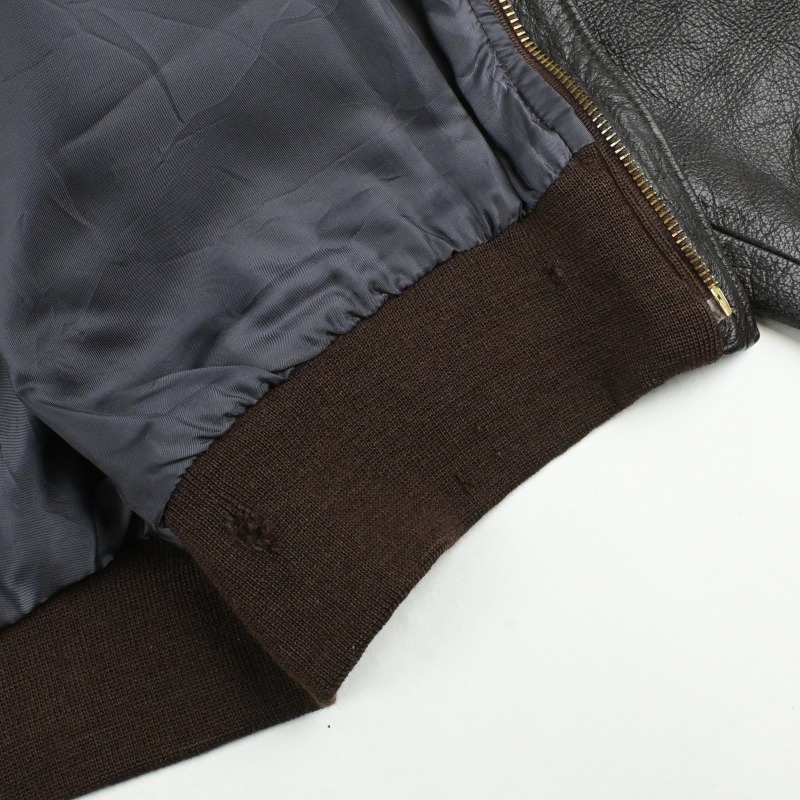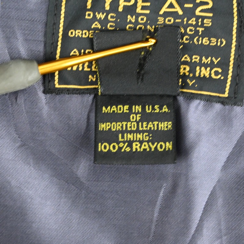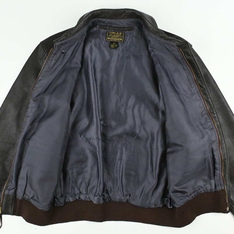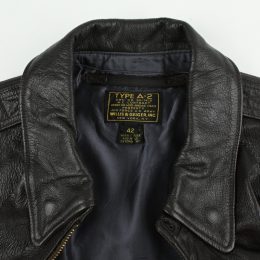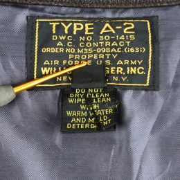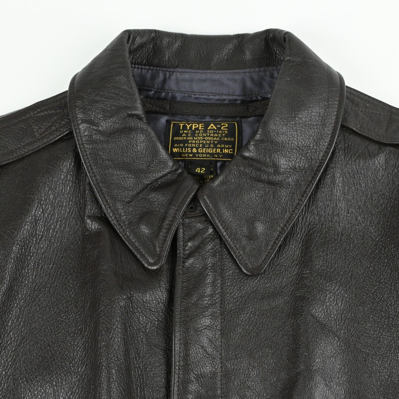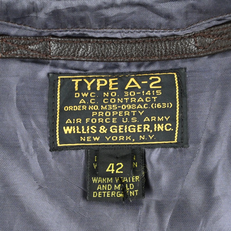 第2次世界大戦戦時下に米軍にA-2を含む衣料を納入した実績を持ち、1930年代のサファリブームの火付け役としても知られるNew Yorkの名門、”Willis Geiger”のA-2タイプのレザージャケットです。