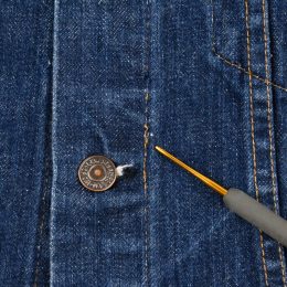 フロント第四ボタン付近にステッチホツレがございます。