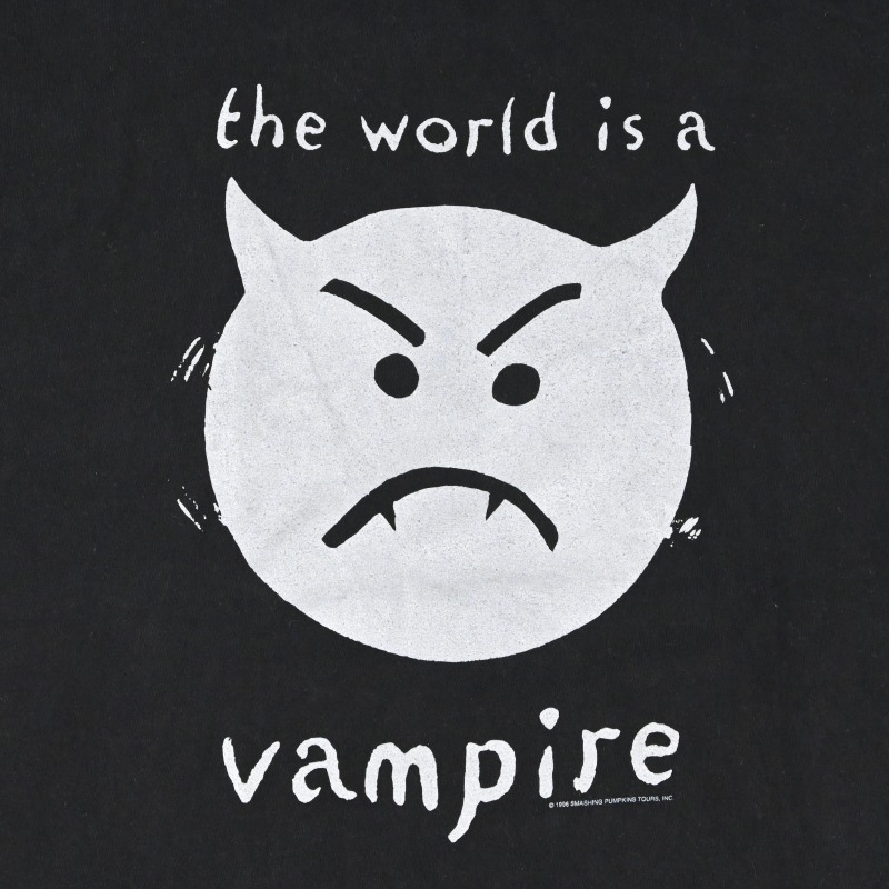 94年リリースのアルバム”Mellon collie and the infinite sadness”のリリースツアーのTシャツで、ヒットタイトル” Bullet with butterfly wings”の冒頭の印象的な1節と、怒りの表情を浮かべるヴァンパイアがプリントされております。