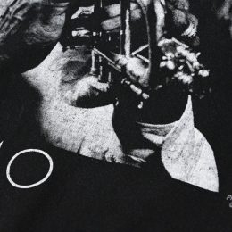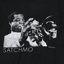 アンサンブル演奏主体だったシーンにトランペットによる即興演奏を広め、スキャットやソウルフルなボーカルスタイルなど革新的な要素持ち込み、後に多大な影響を与えたジャズ界の巨人、Louie ArmstrongのTシャツです。